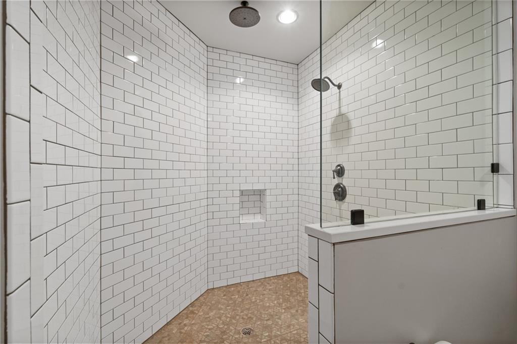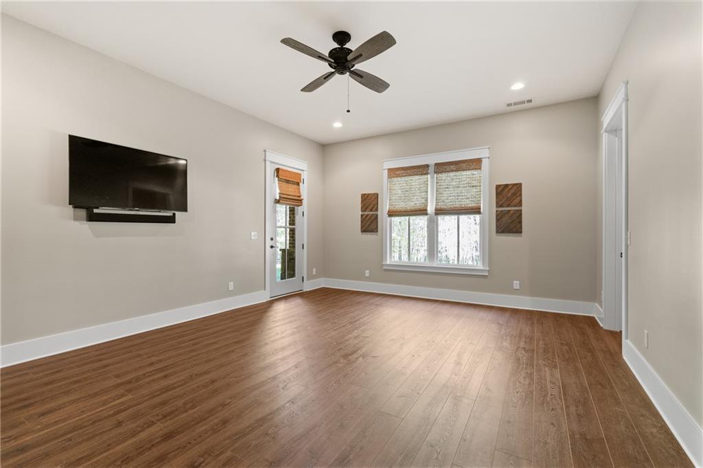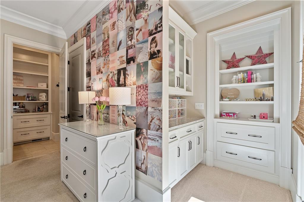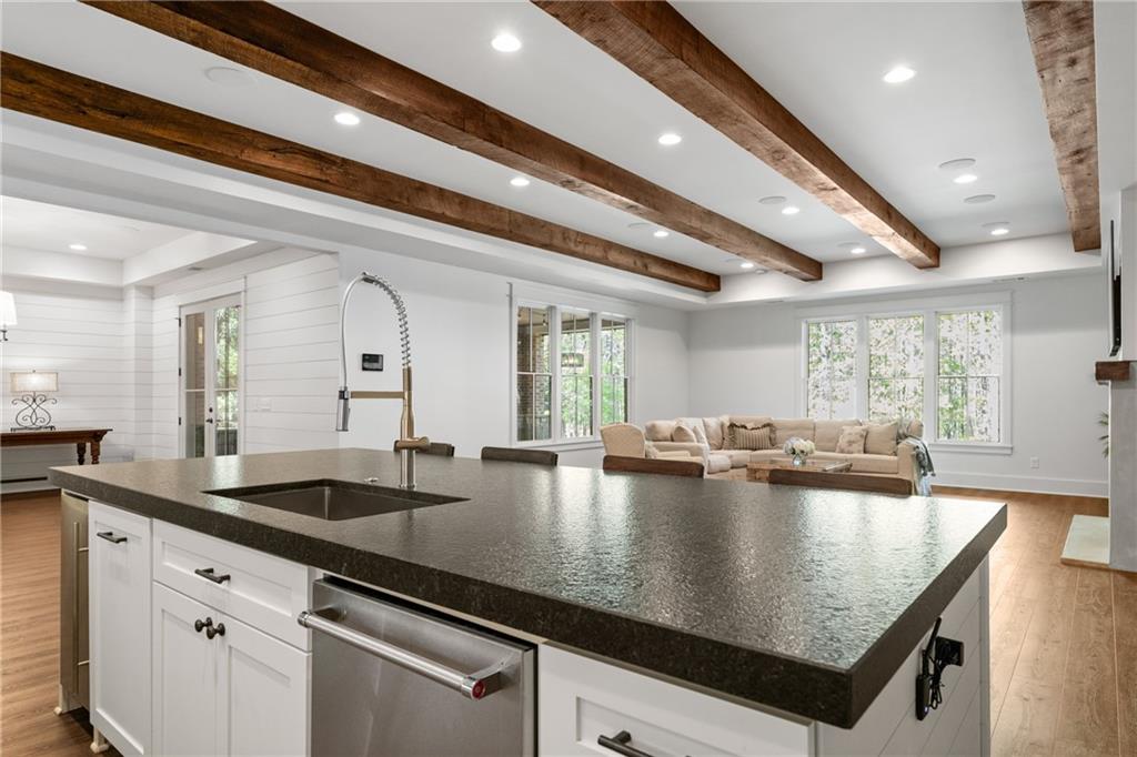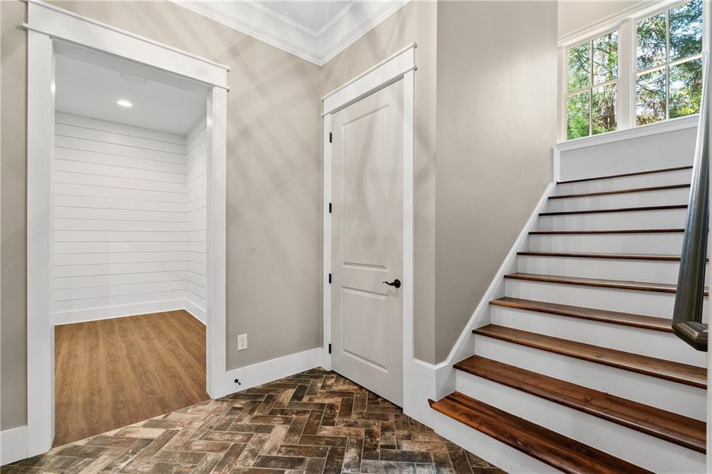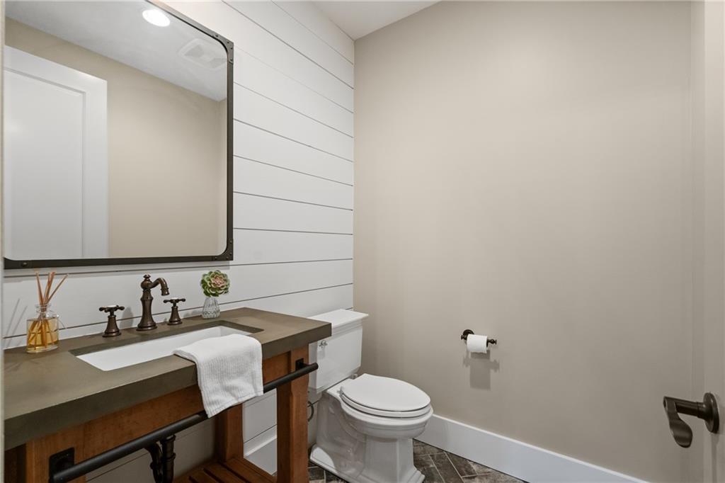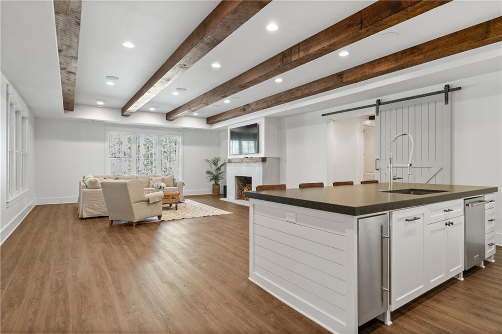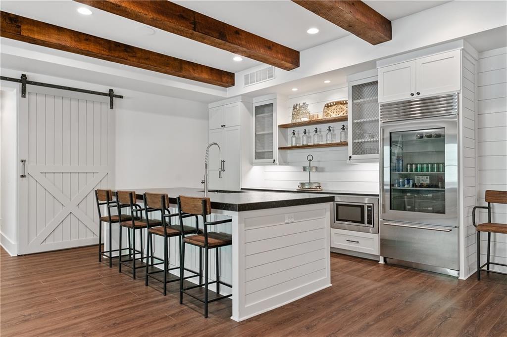 The terrace level is thoughtfully designed for both entertaining and everyday living, featuring a game room, flex space, powder room, and a well-appointed bar/kitchen with warming drawer, ice maker, microwave, and a large leathered granite island with mitered edges. The walkout family room--accented by wood beams and shiplap--opens to a covered patio with space to expand for a future pool, outdoor living area, or fireplace. A private guest suite with ensuite bath completes this level.