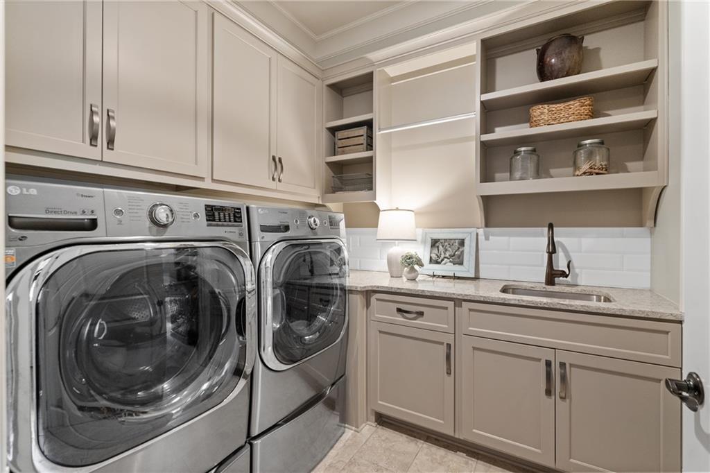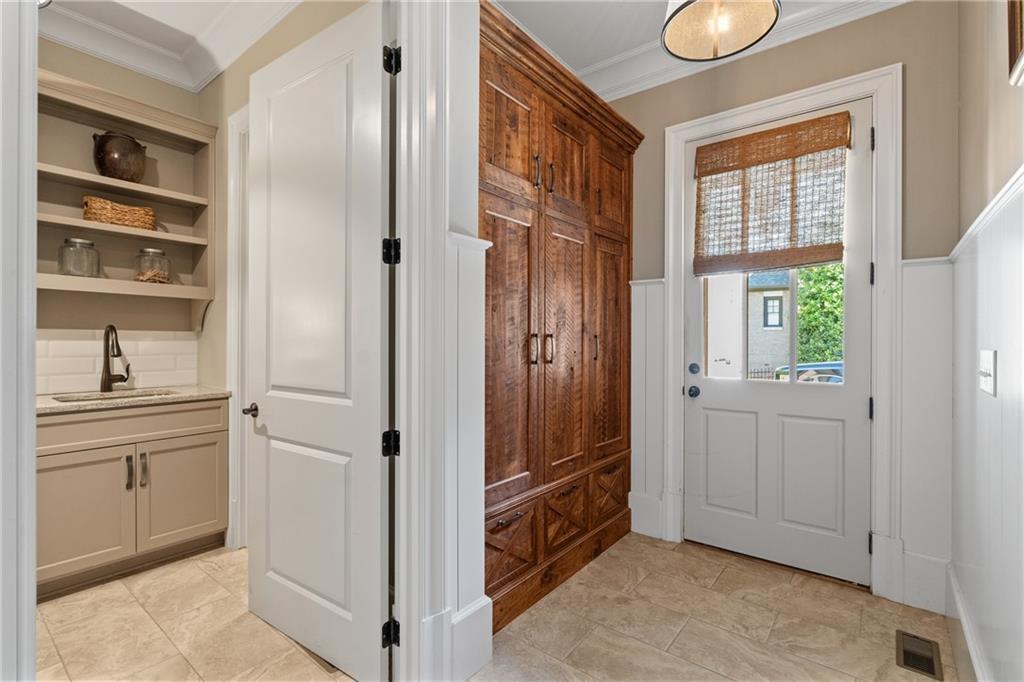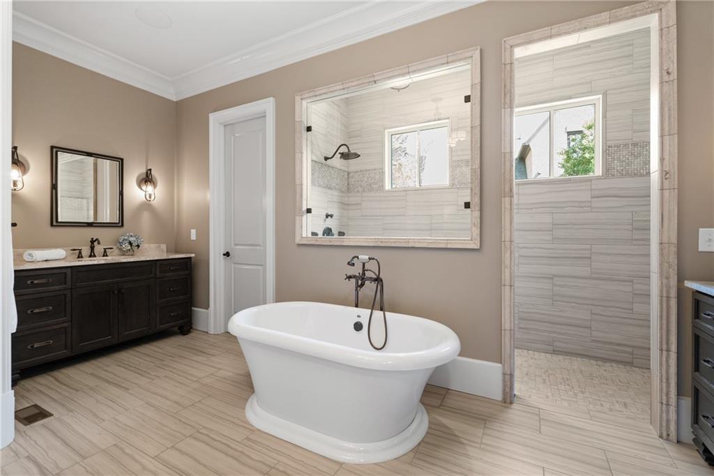 The main-level primary suite featuring a spa-inspired bath w/a zero-entry shower, freestanding soaking tub, dual vanities, and expansive dual closets with direct access to the laundry room. An additional ensuite bedroom, a thoughtfully designed mudroom w/built-in cabinetry, and a powder room complete the main floor.