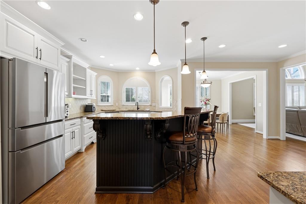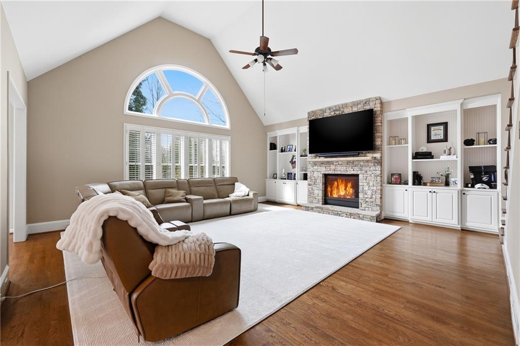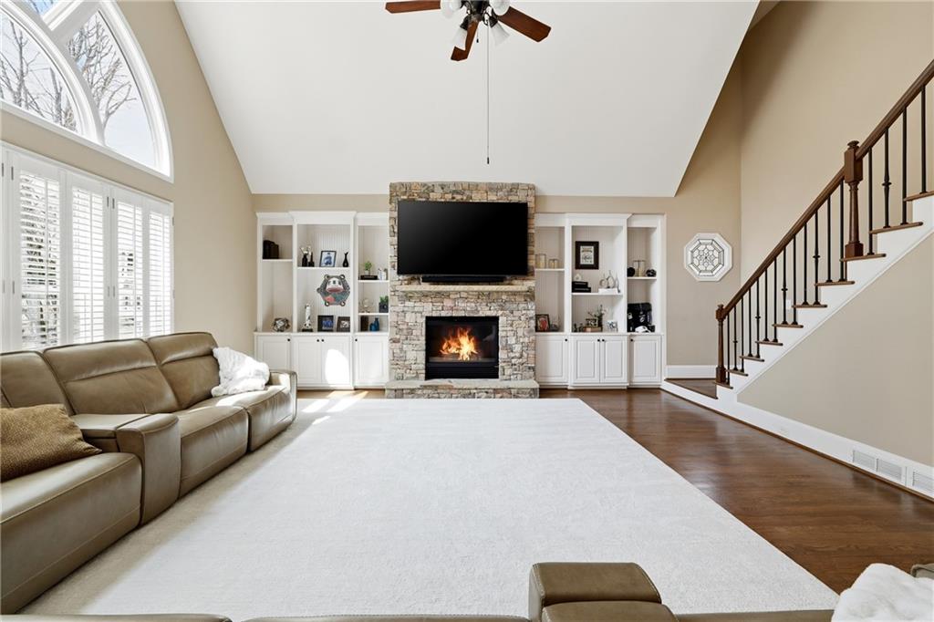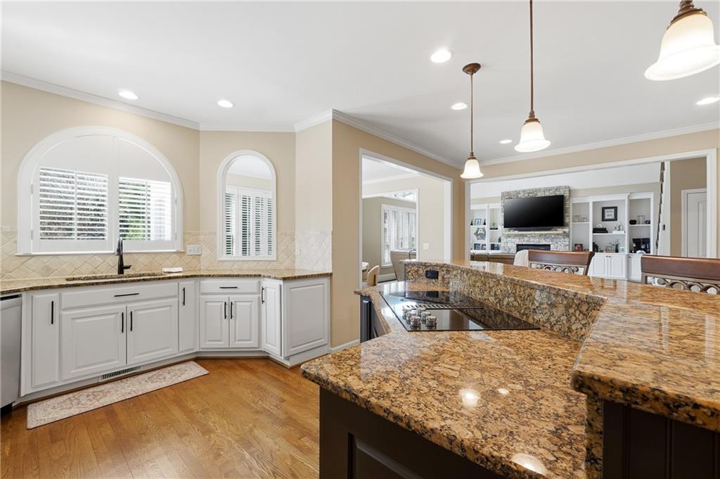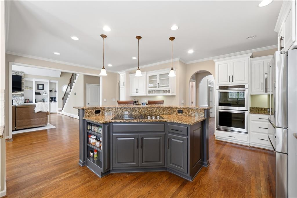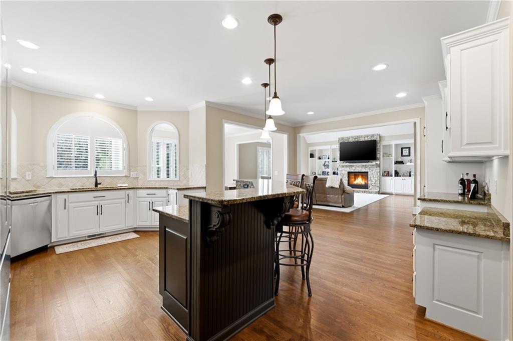 Upon entering, you are welcomed by rich oak hardwood flooring, elevated architectural finishes, and an open, light-filled floor plan designed for modern living. The gourmet kitchen is a true centerpiece, featuring premium stainless steel appliances, custom cabinetry, sleek granite countertops, and a spacious walk-in pantry. The kitchen flows seamlessly into the dramatic two-story fireside family room, creating an ideal setting for both everyday living and entertaining.